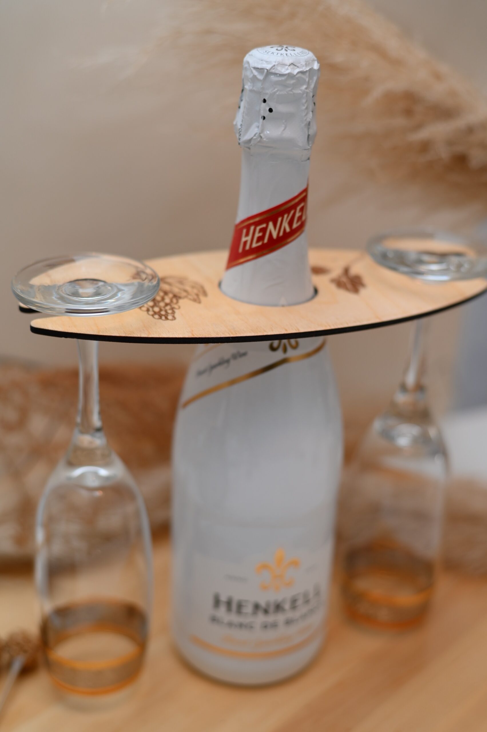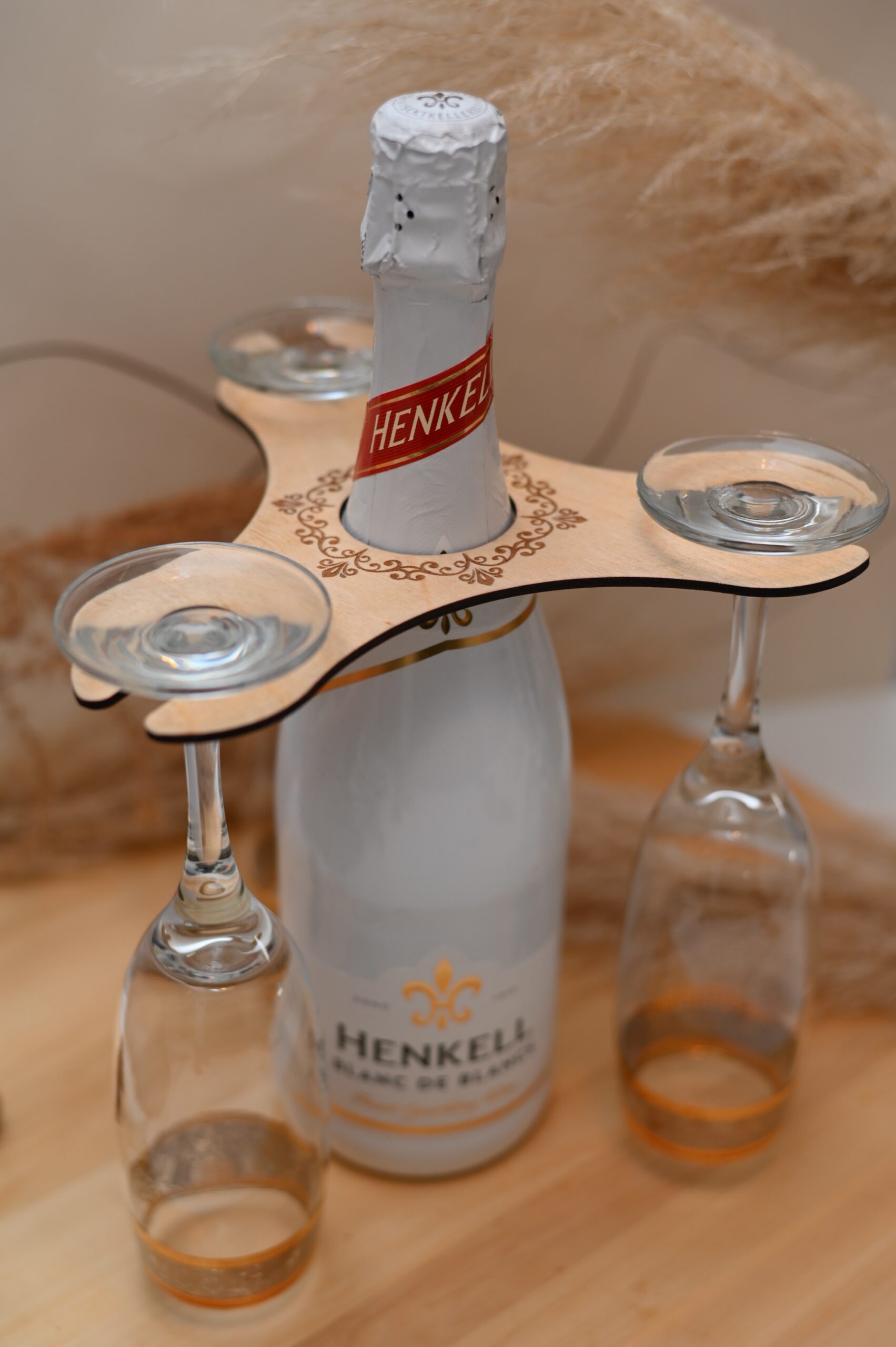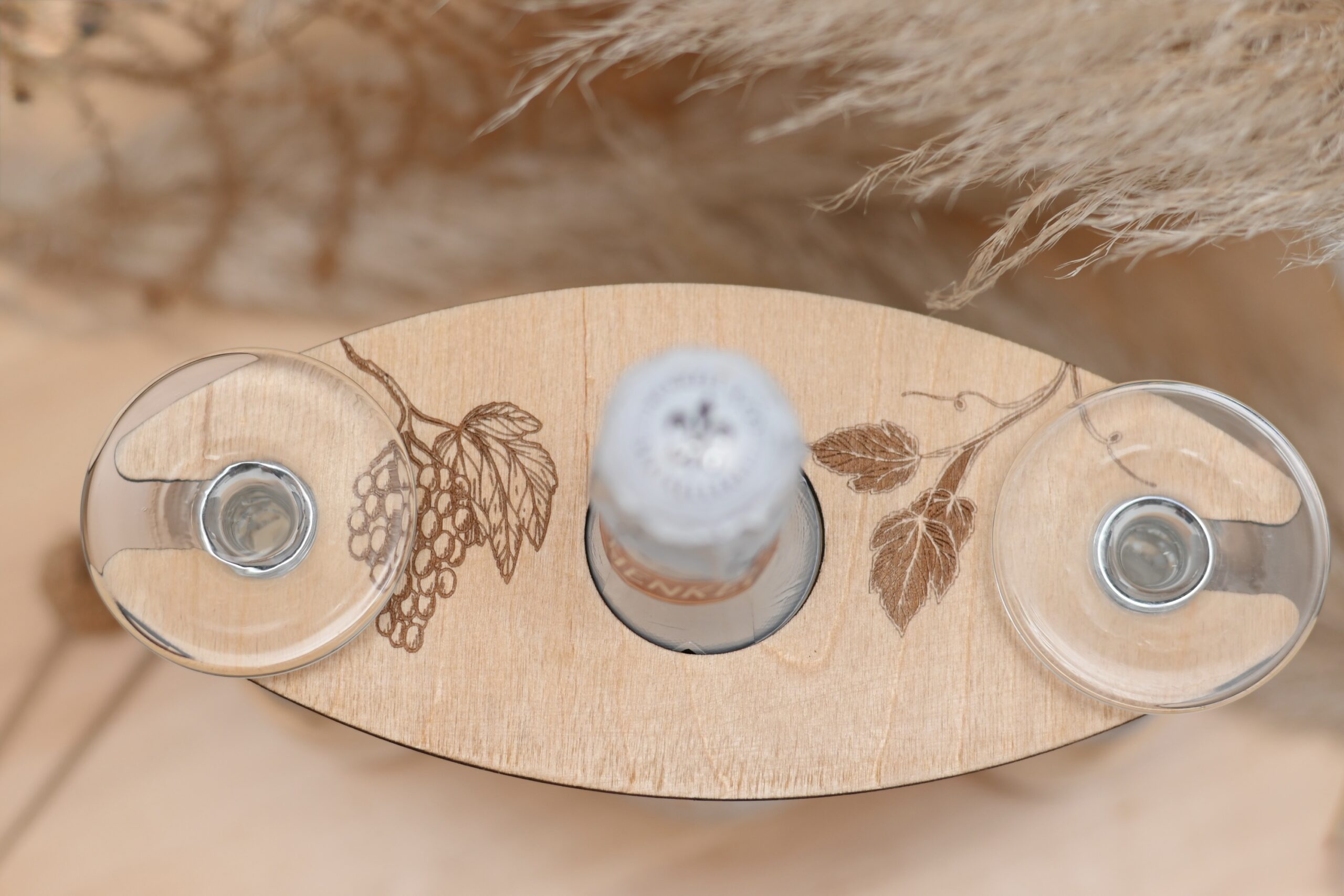 Unesi eleganciju i praktičnost u svaku proslavu uz drveni držač čaša za bocu, izrađen od visokokvalitetnog drveta s preciznim laserskim rezanjem i dekorativnom gravurom. Ovaj unikatni dodatak omogućava da uz bocu vina ili šampanjca poneseš i dvije ili tri čaše – savršeno za posluženje ili kao originalan poklon. Dostupan je u dvije varijante: za 2 ili 3 čaše, i predstavlja idealan izbor za svadbe, godišnjice, rođendane, useljenja ili poslovne prilike, kombinujući funkcionalnost i estetiku.